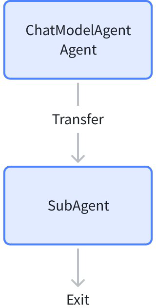 Transfer corresponds to the [Transfer Collaboration Mode]. When an Agent produces an AgentEvent containing a TransferAction during runtime, Eino ADK calls the Agent specified by the Action. The called Agent is called a sub-Agent (SubAgent).